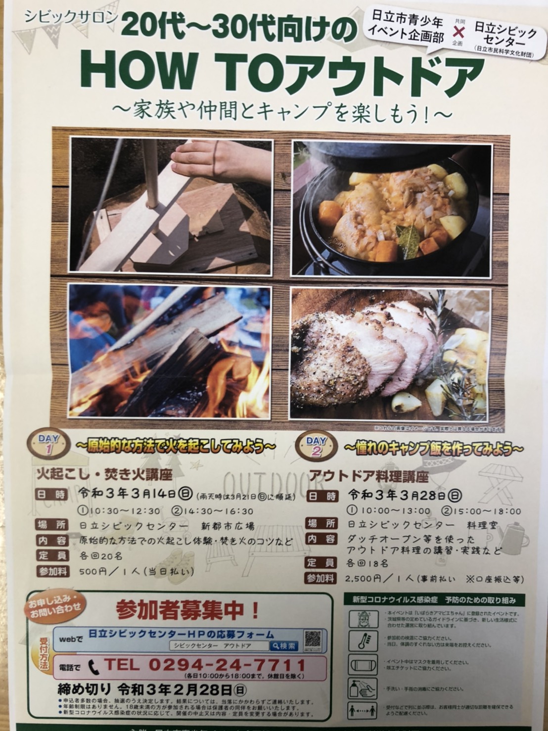 3月14日(日)に日立シビックセンター新都市広場で開催される『20代~30代向けのHOW TO アウトドア』イベントにカリスマジャパンも参加します。当日は、火起こし・焚き火講座が行われます(申し込みはシビックセンターのホームページからどうぞ)。