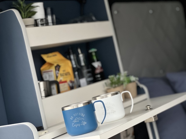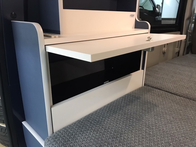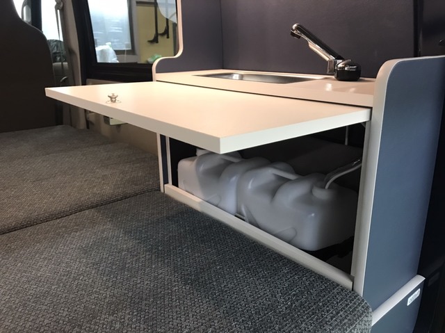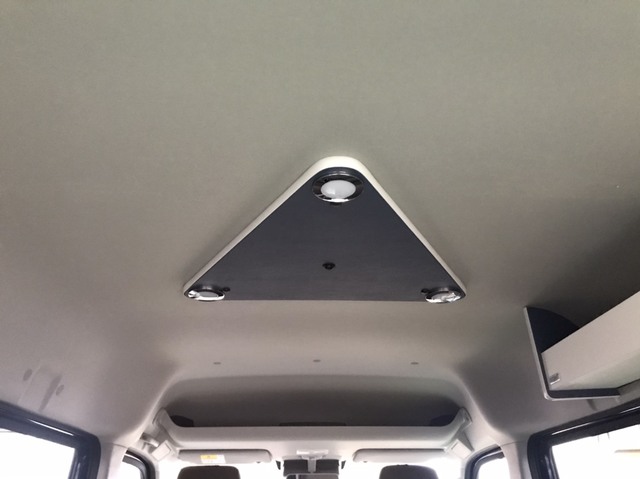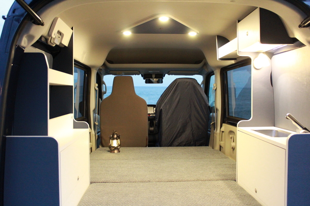 - サブバッテリーシステム(走行充電)・ステンレス製ギャレー・給排水タンク(10ℓ×2)・インバーター250W&100VACコンセント・右キャビネットLEDダウンライト・天井トライアングルLEDライト